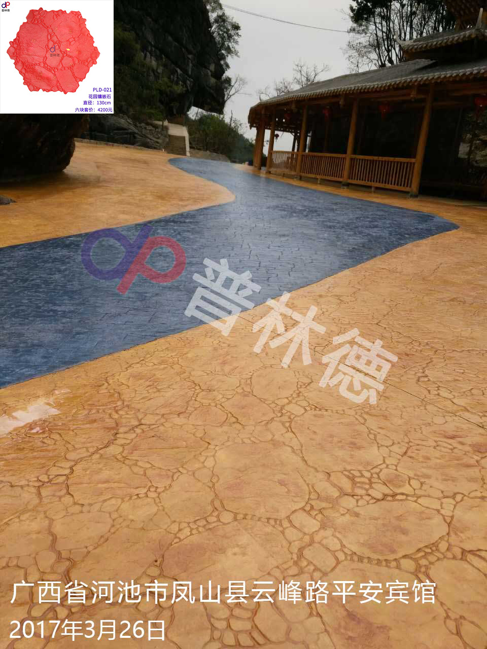 項目名稱:廣西省河池市鳳山縣云峰路平安賓館壓模壓花地坪工程 項目地址:廣西 竣工時